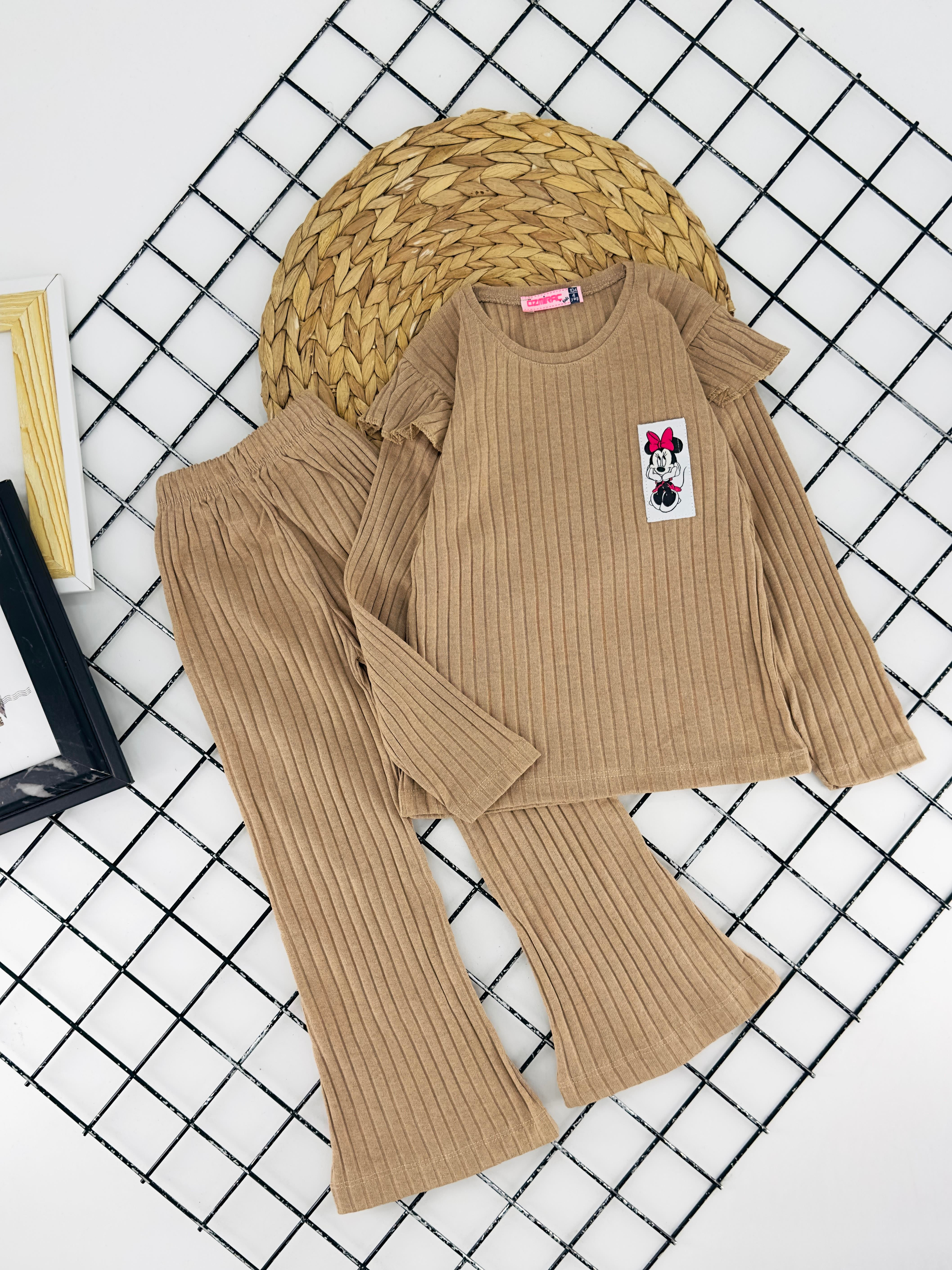 7768-2 Omuz fırfırlı Mne Detaylı Kız Çocuk Fitilli Takım-BEJ