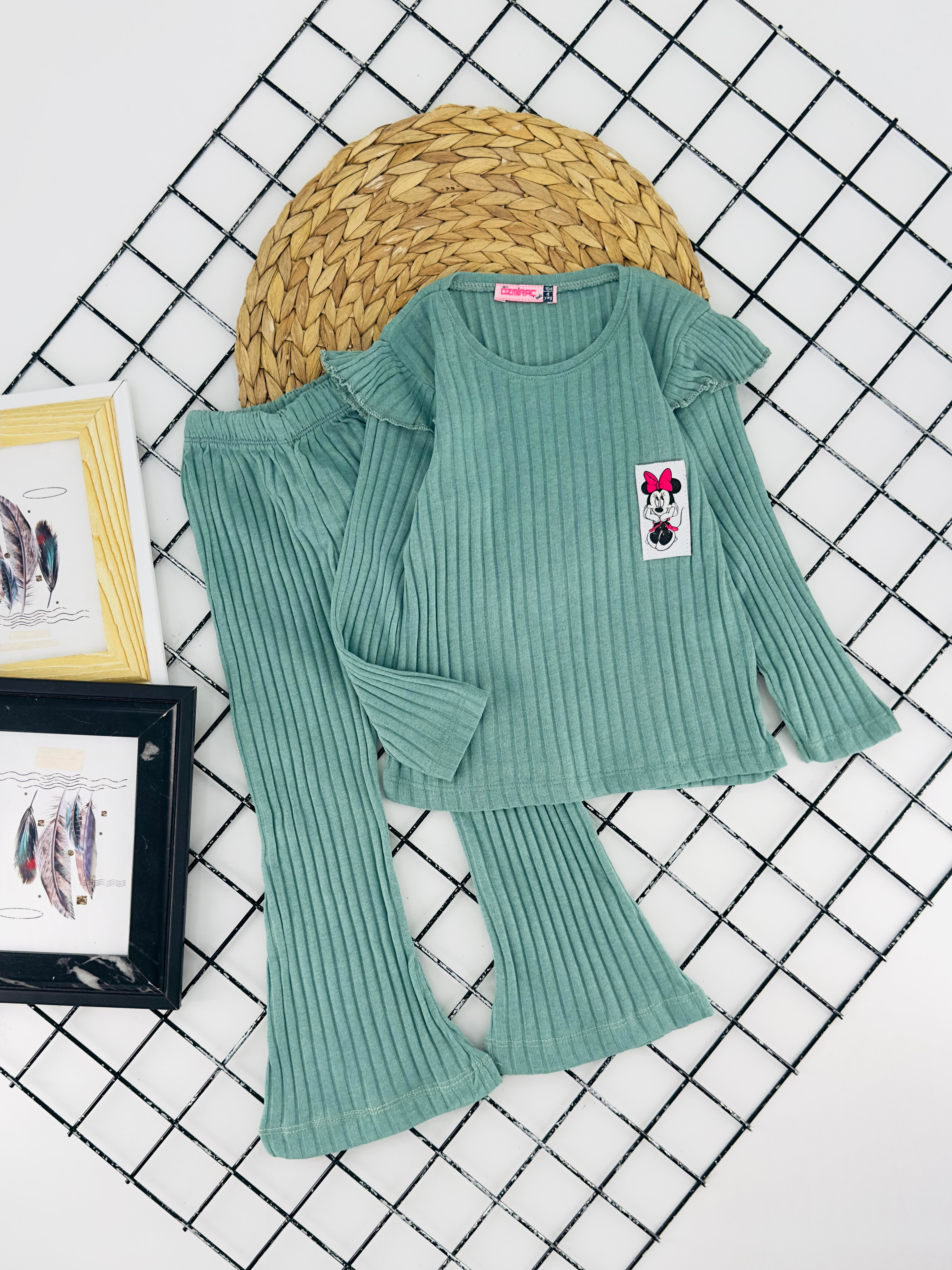 7768 Omuz Fırfırlı Mne Detaylı Kız Çocuk Fitilli Takım-YEŞİL