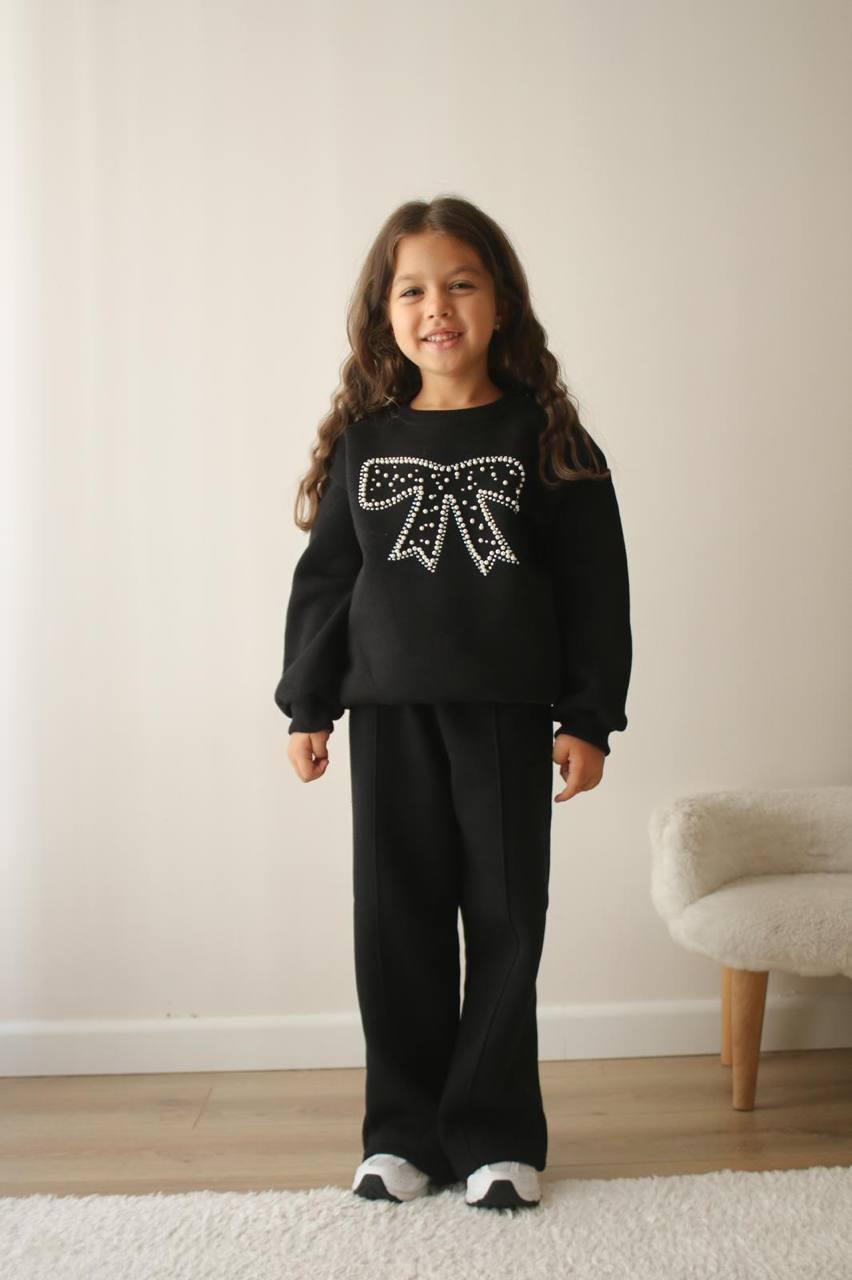 812 Bocuklu Fiyonk Detaylı Baskılı Kız Çocuk Şardonlu Üç İplik Takım-SİYAH