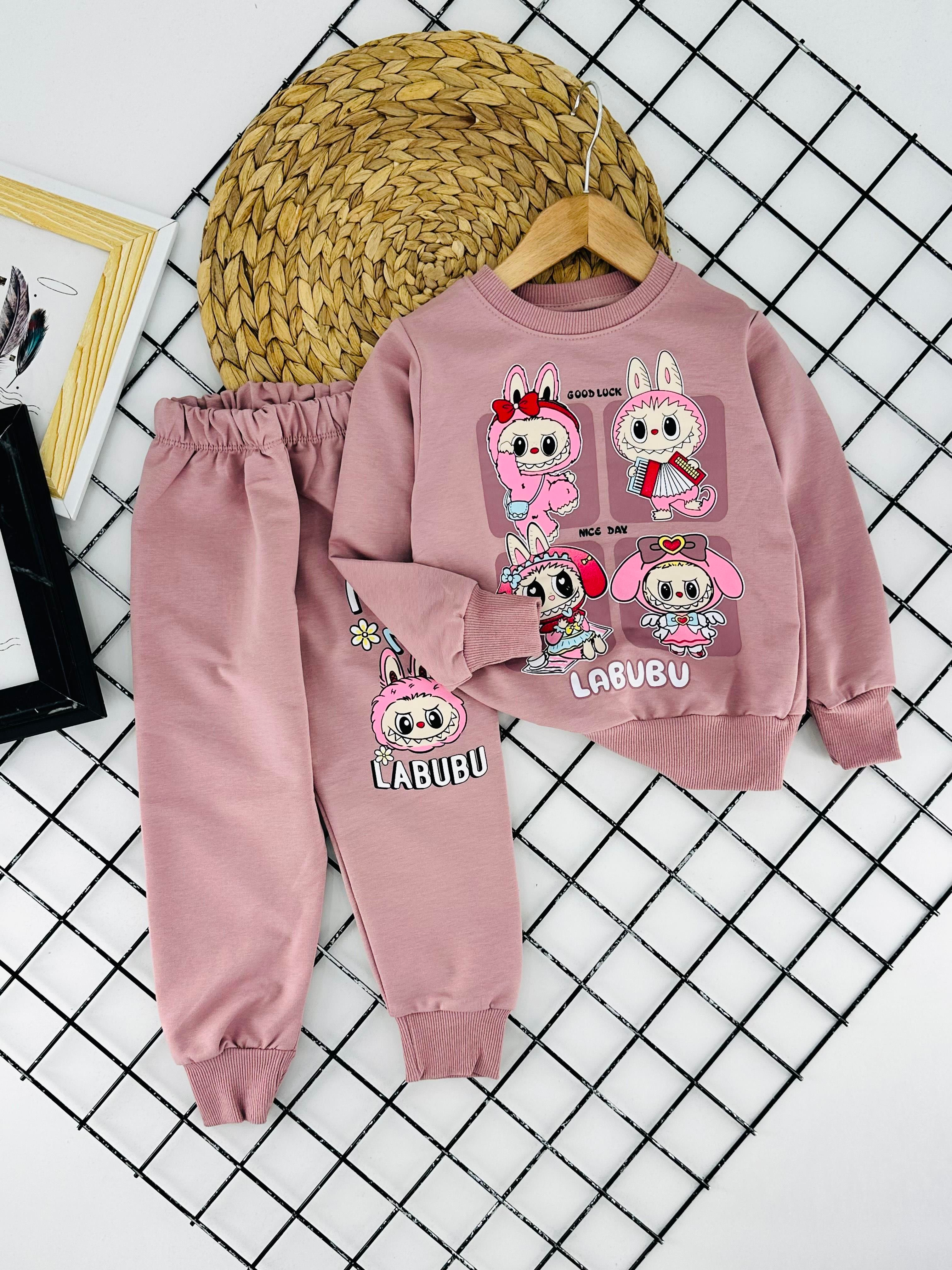 8227 İkili Labubu Baskılı Kız Çocuk İki İp Takım-GÜL KURUSU