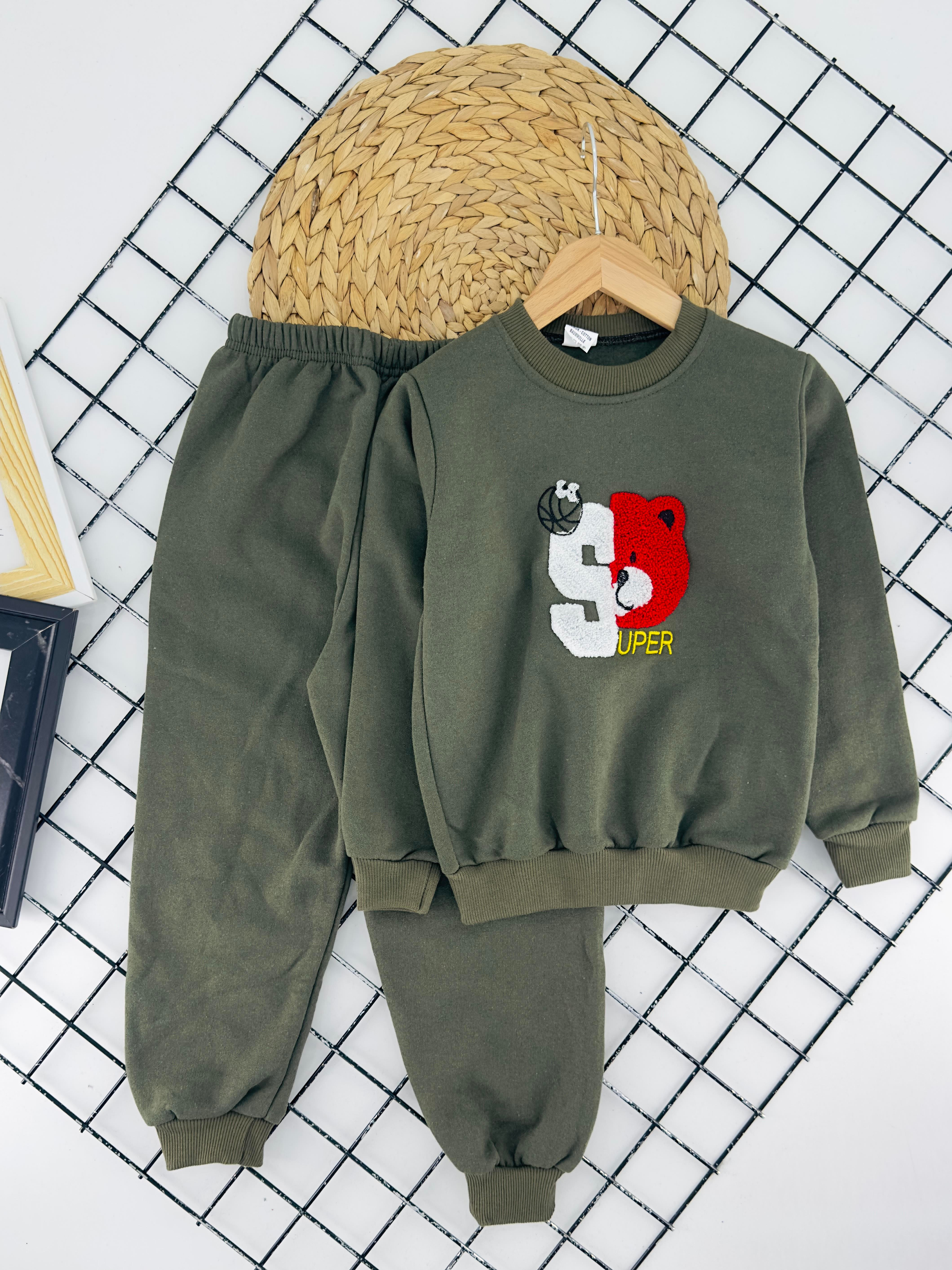 900-1 Ayıcık Nakışlı Erkek Çocuk İki İplik Şardonlu Takım-HAKİ YEŞİLİ