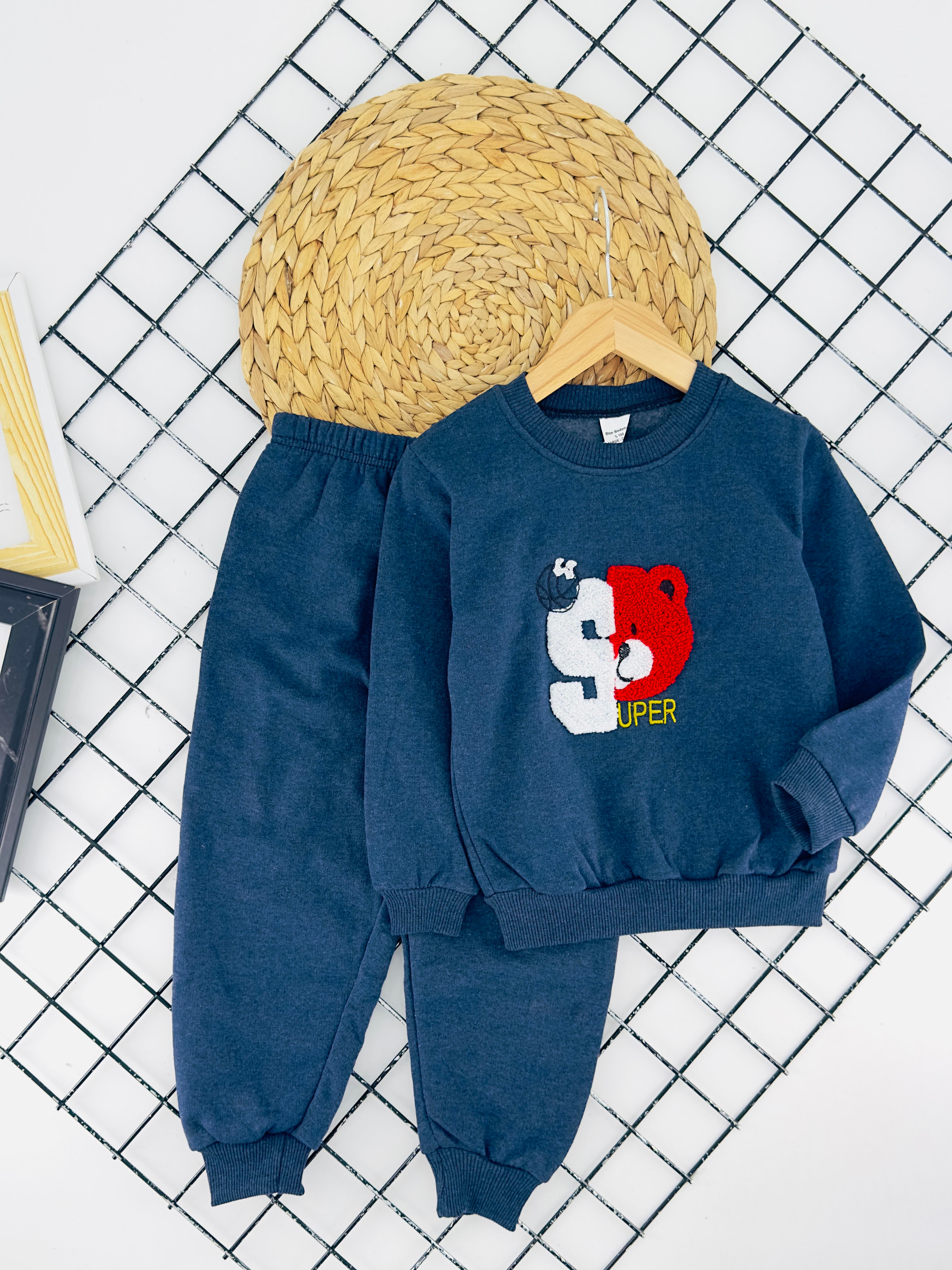 900-1 Ayıcık Nakışlı Erkek Çocuk İki İplik Şardonlu Takım-İNDİGO MAVİ