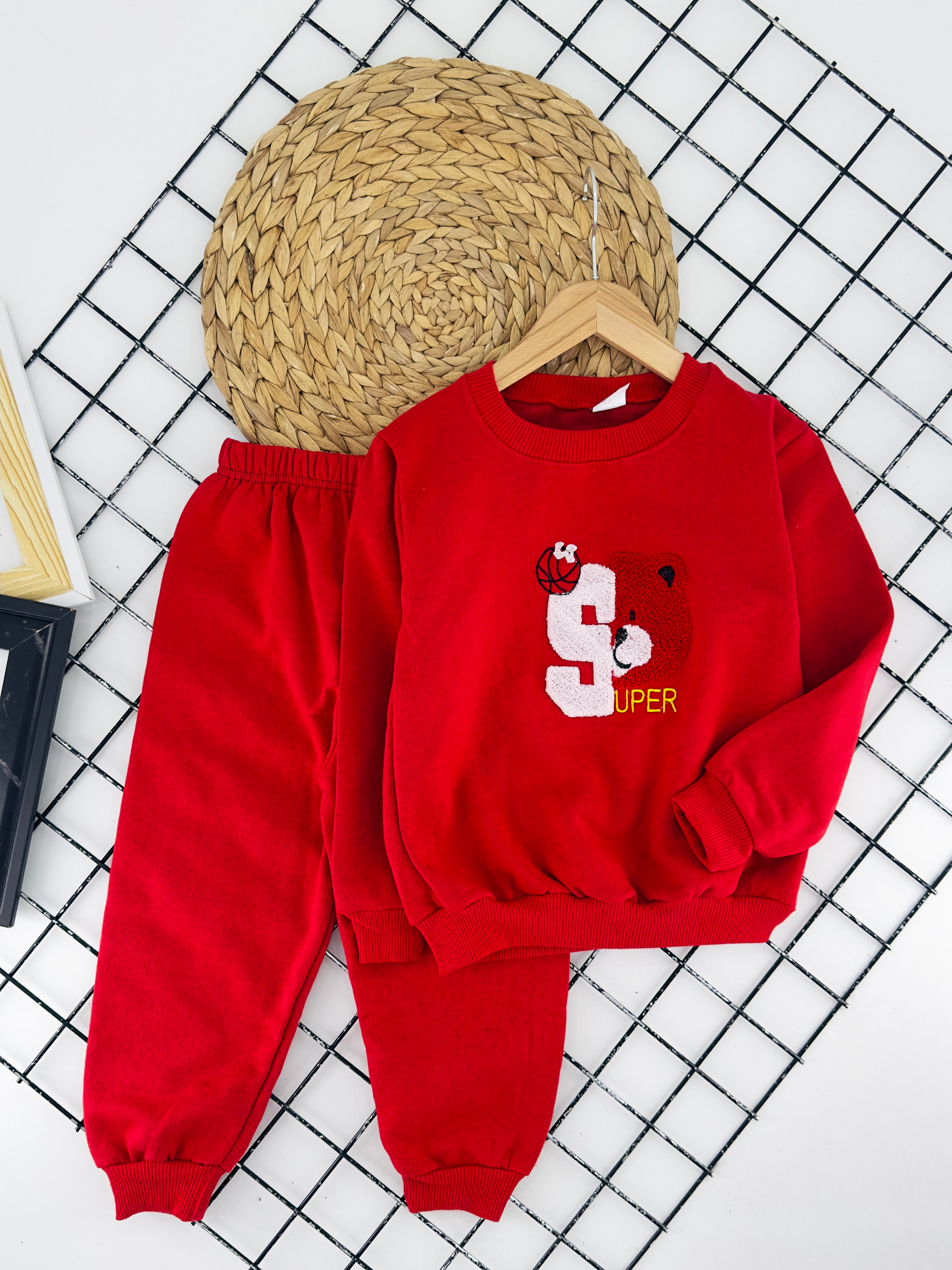 900-1 Ayıcık Nakışlı Erkek Çocuk İki İplik Şardonlu Takım-KIRMIZI