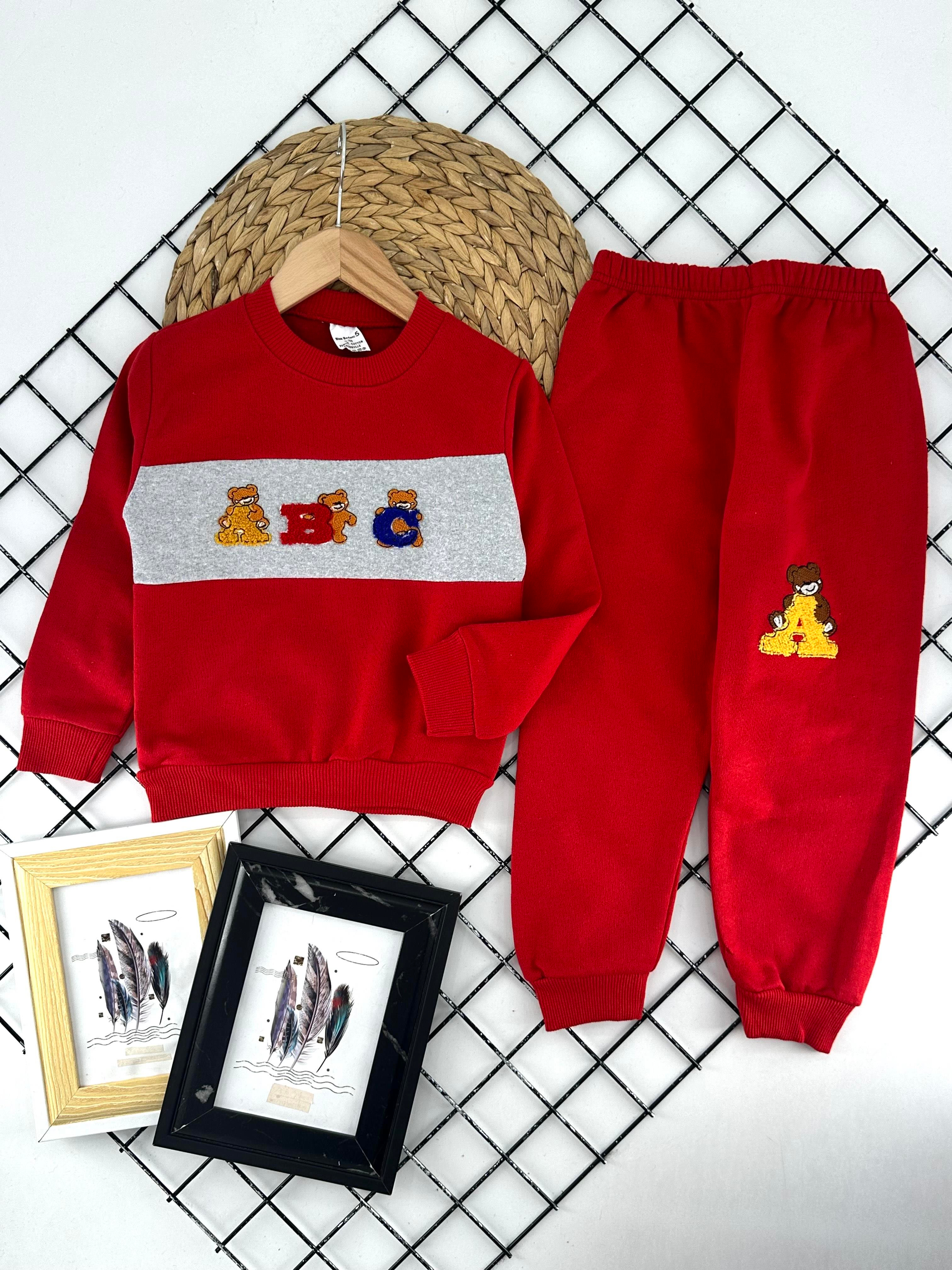 900-3 Abc Yazılı Nakışlı Erkek Çocuk İki İplik Şardonlu Takım-KIRMIZI