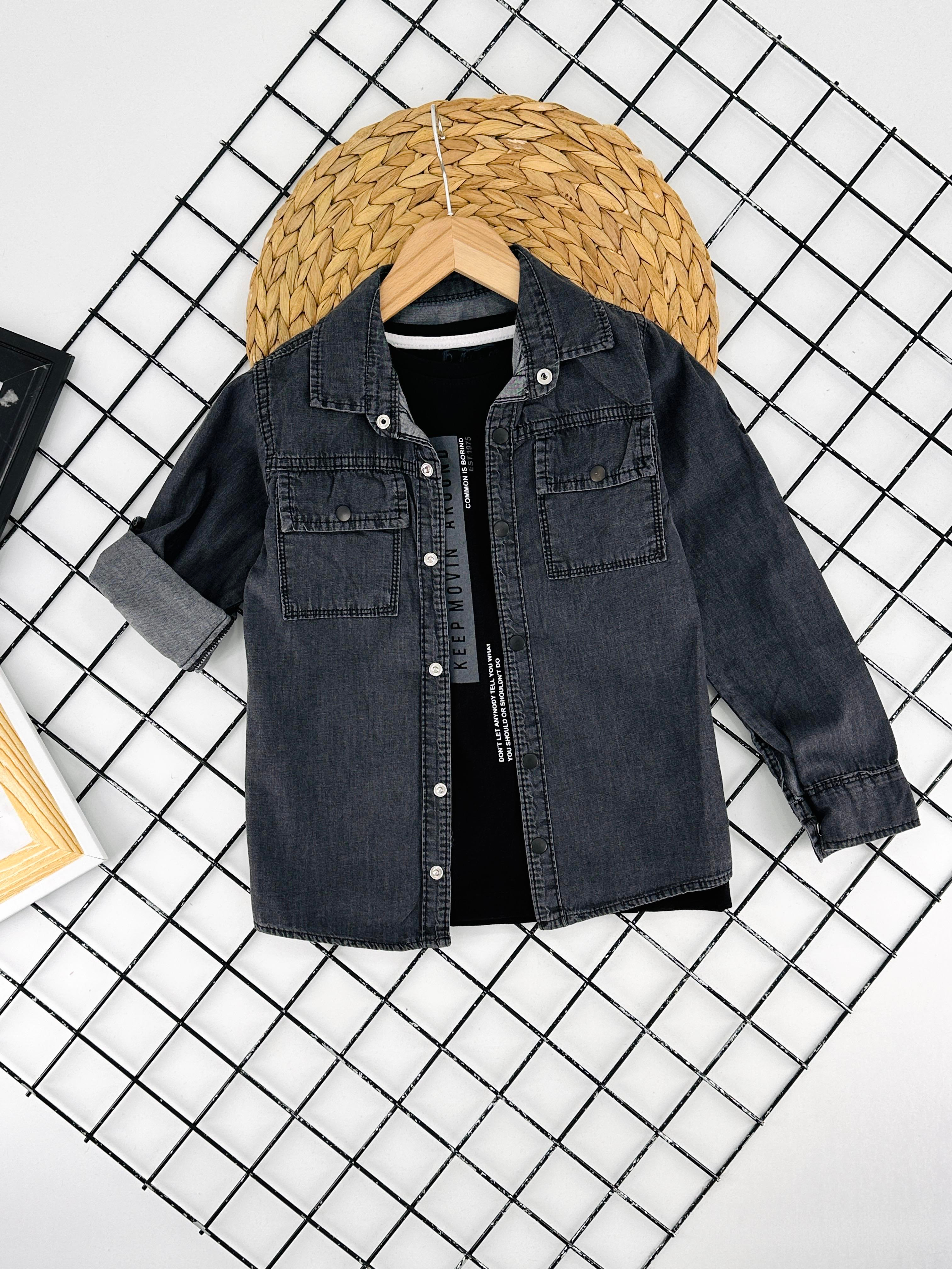 9011 Erkek Çocuk Tişörtlü Kot Gömlek-FÜME