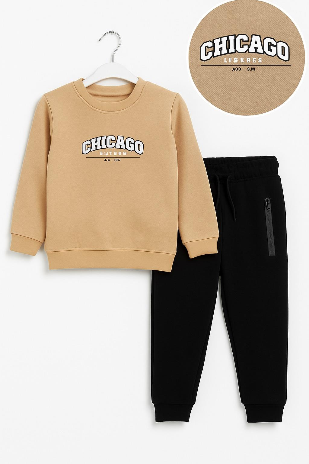 9941 Chıcago Yazılı Baskılı Erkek Çocuk İki İplik Penye Takım-BEJ
