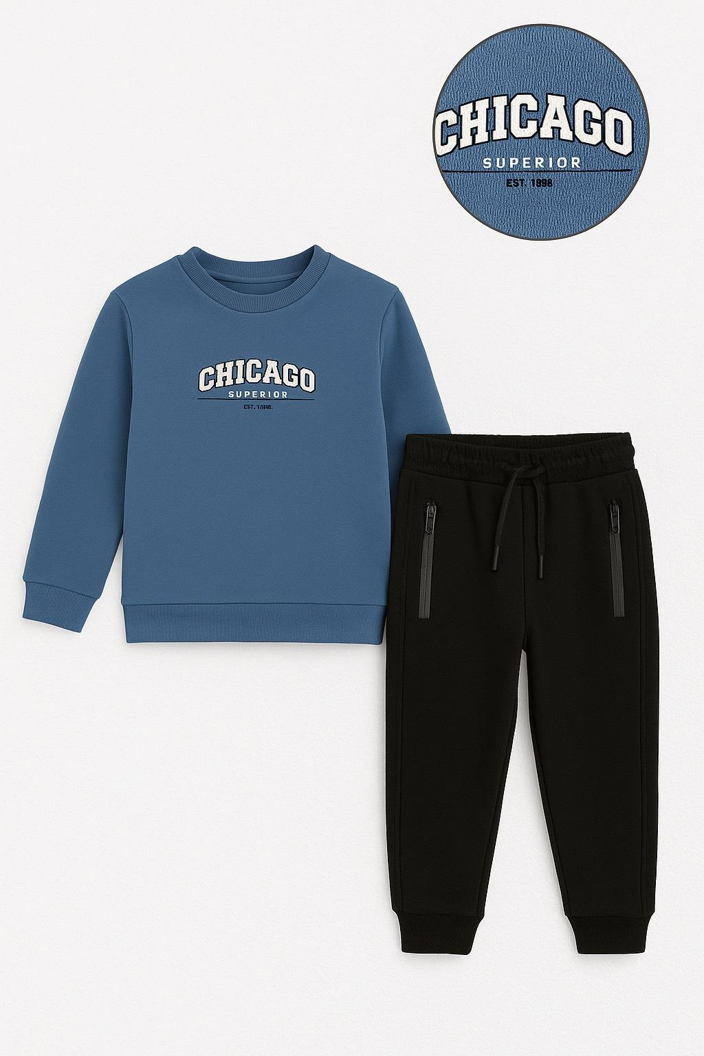 9942 Chıcago Yazılı Baskılı Erkek Çocuk İki İplik Penye Takım-İNDİGO MAVİ