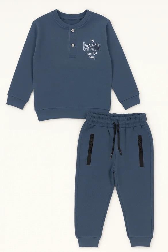 9944 My Brain Yazılı Nakışlı Erkek Çocuk İki İplik Penye Takım-İNDİGO MAVİ