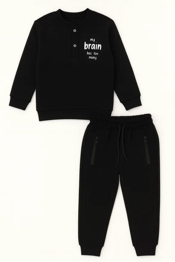 9944 My Brain Yazılı Nakışlı Erkek Çocuk İki İplik Penye Takım-SİYAH