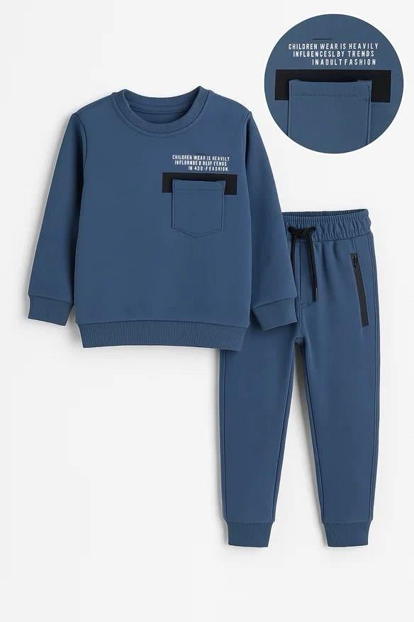 9959 Chıldien Yazılı Baskılı Erkek Çocuk İki İplik Penye Takım-İNDİGO MAVİ