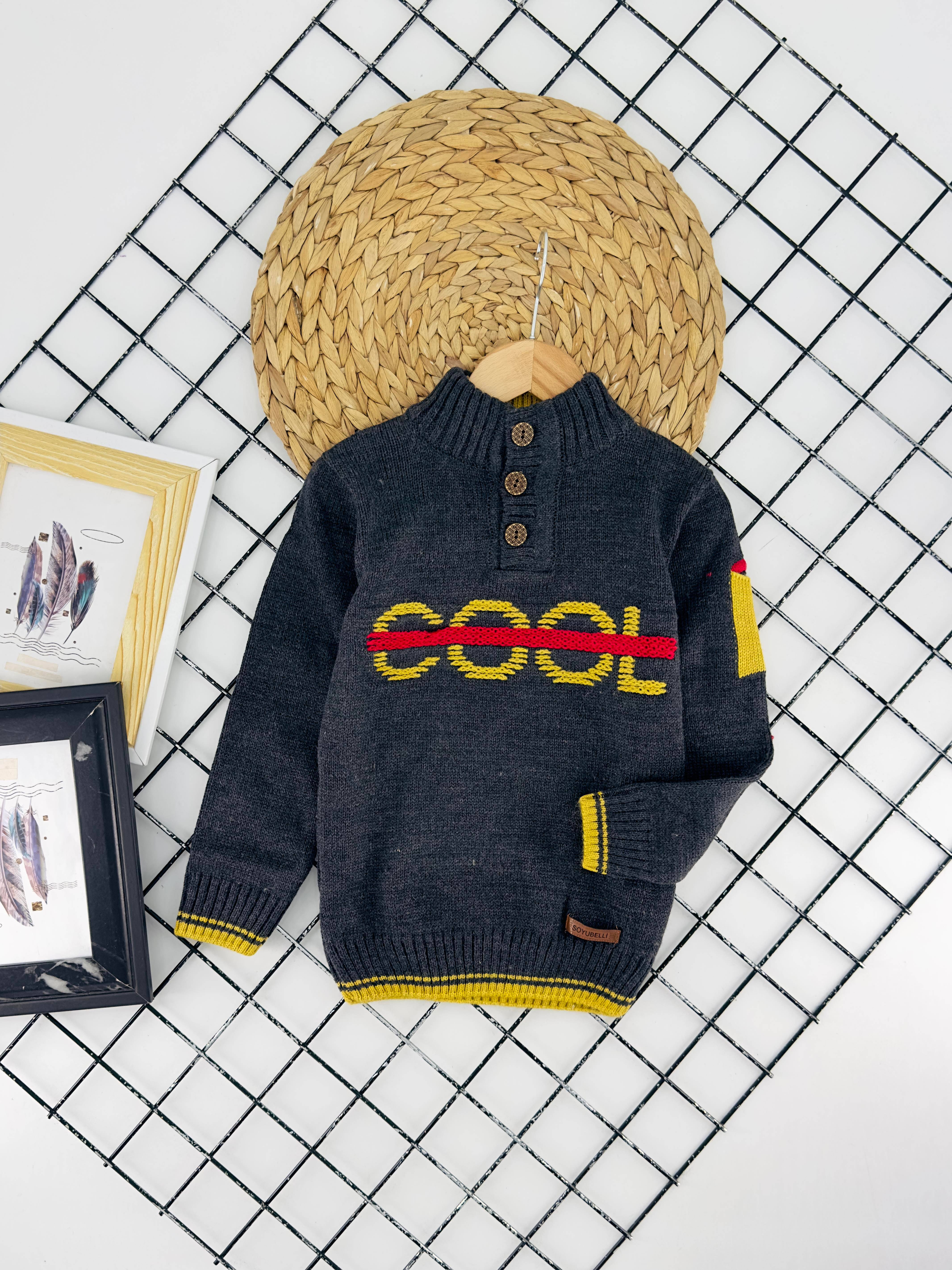 A03-1 Düğmeli Cool Yazılı İşlemeli Erkek Çocuk Kazak-FÜME