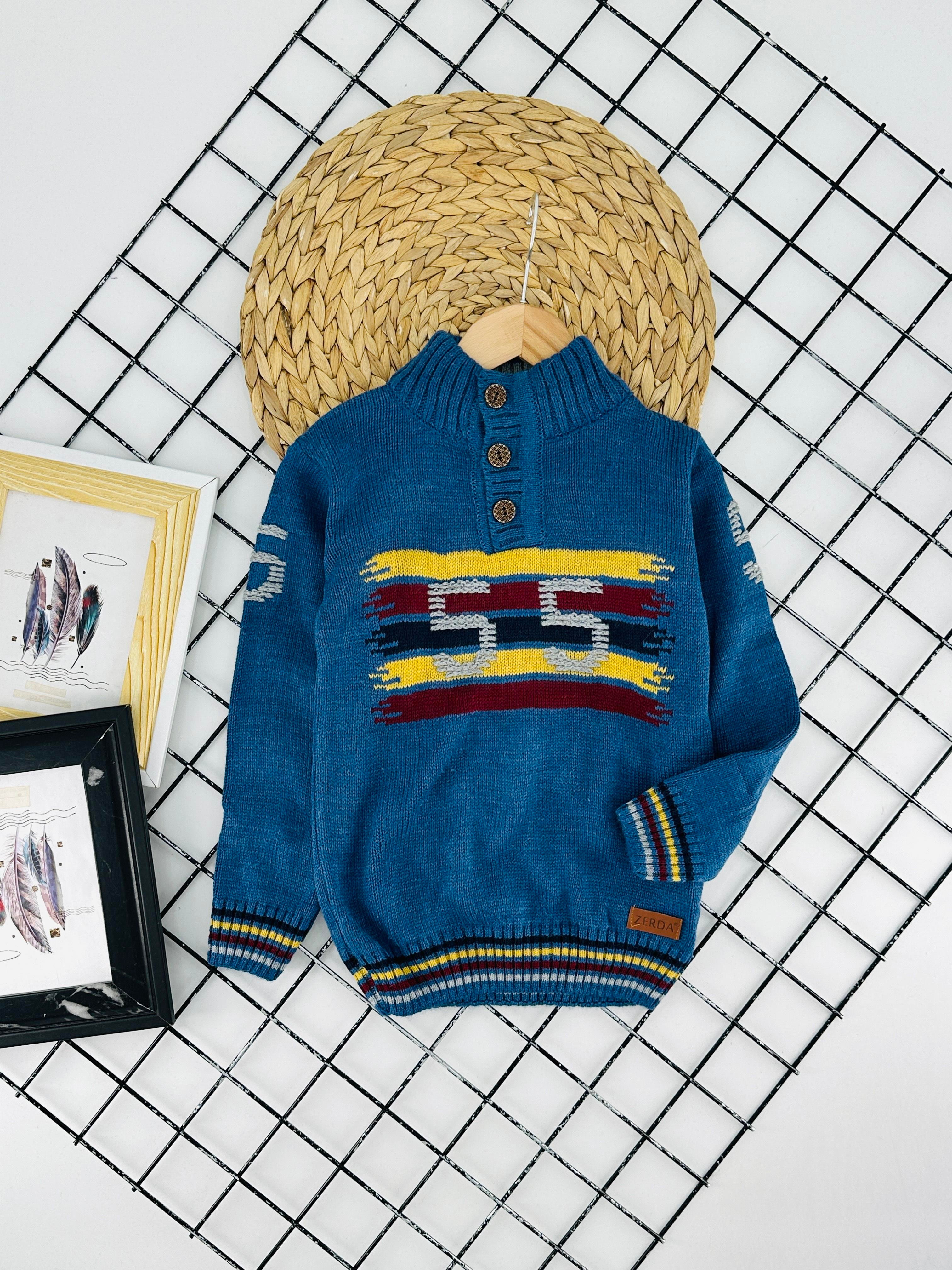 A03 Önü Düğmeli 55 Nakışlı Erkek Çocuk Triko Kazak-İNDİGO MAVİ