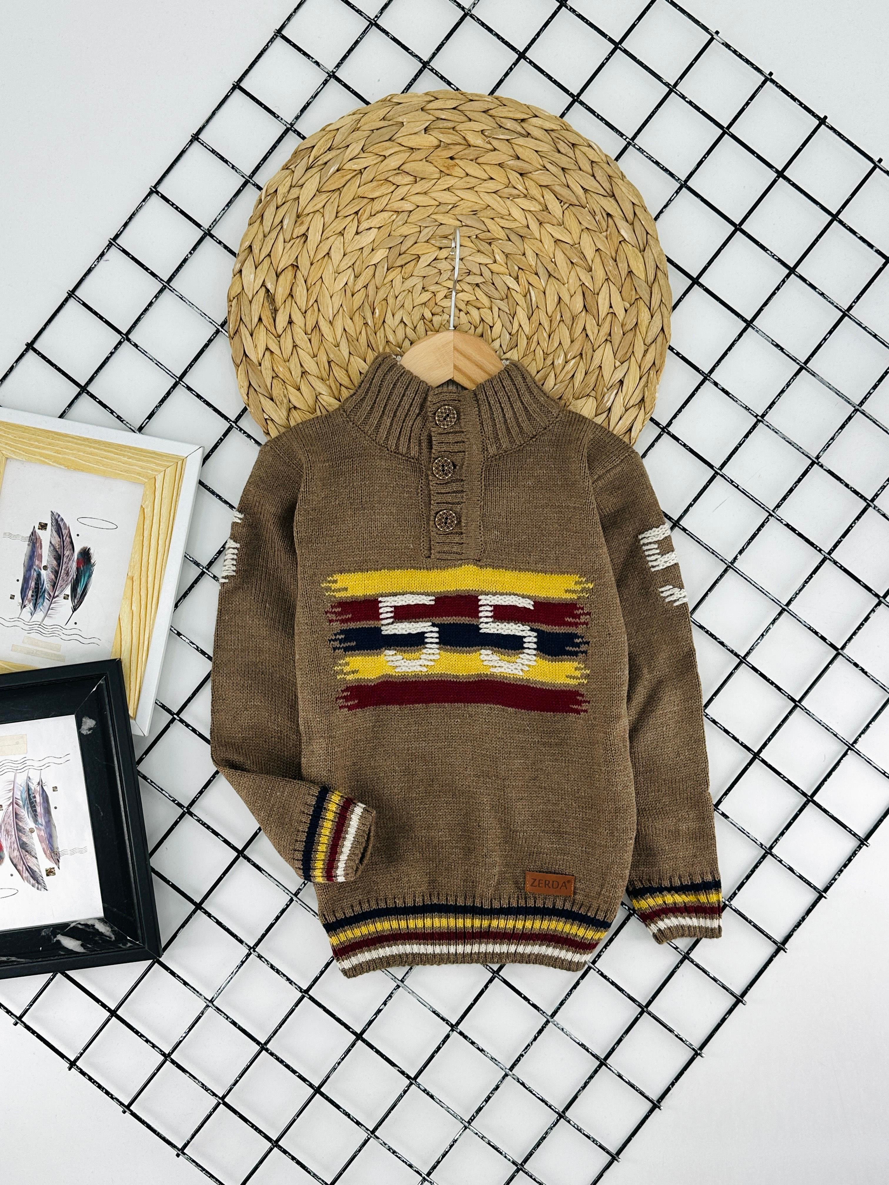 A03 Önü Düğmeli 55 Nakışlı Erkek Çocuk Triko Kazak-KAHVE